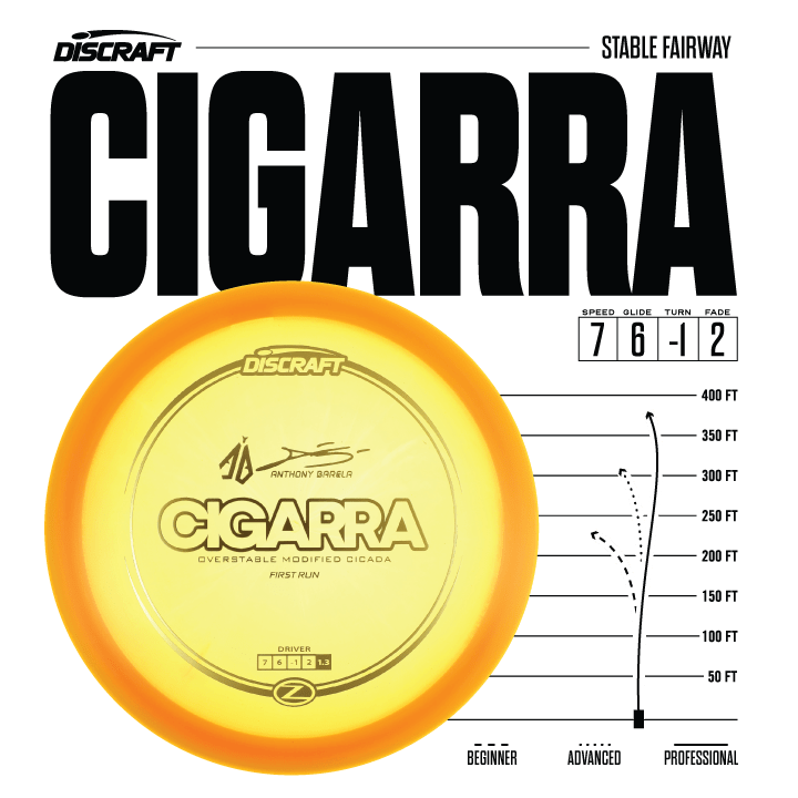The Cigarra is an understable fairway driver designed for effortless distance and smooth, controllable turnovers. Its glide and workable flight make it perfect for hyzer-flips, long drifting lines, and shaping shots through tight fairways.