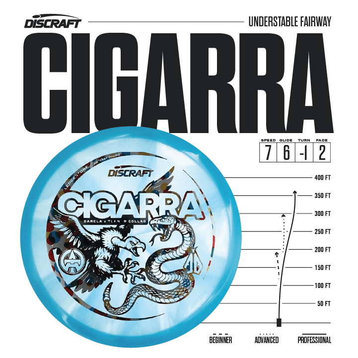The Cigarra is a torque-resistant fairway driver with a forward-driving flight and consistent fade that supports power forehands, controlled hyzers, and demanding fairway drives in wind. Its stability profile allows players to push confidently into high-power angles without losing control or sacrificing distance. Whether thrown backhand or forehand, the Cigarra resists unwanted turn, holds straight under pressure, and finishes with purpose, making it a trusted tool for attacking technical fairways with force and precision.