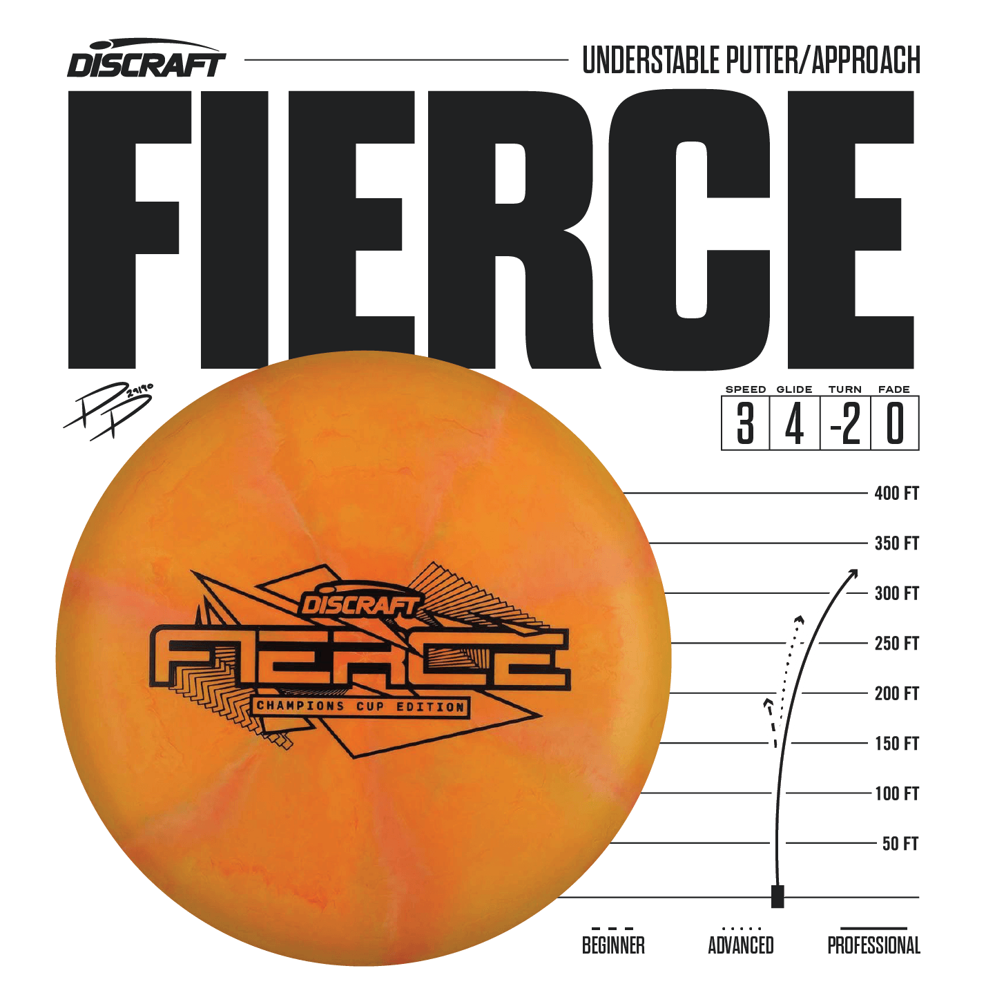 Experience the thrill of disc golf with the Fierce putter, designed for players seeking to perfect anhyzer approach shots and turnover putter throws. This understable putter in the Paige Pierce line provides excellent glide for far-reaching turnover approaches and drives. Although it may not be torque resistant, it’s the perfect disc for honing your backhand turnover shots. With its low profile, it might feel a bit odd in the hand, but once you master the grip, you'll love the control it offers. The Fierce is the preferred putting putter of Paige Piere and many Discraft pros. Bag the Fierce, a disc that caters to all levels and styles of play.