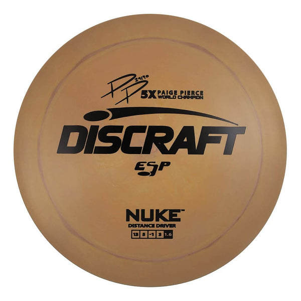 The Paige Pierce 5x ESP Nuke is a high-speed distance driver designed for maximum distance with minimal effort. Its wide rim and refined aerodynamics provide exceptional velocity, while the -1 turn and 3 fade offer a reliable flight path for powerful throws. Crafted in Discraft's ESP plastic, it delivers a perfect blend of grip and durability, while featuring vibrant swirl patterns. This signature edition celebrates Paige Pierce's five world championships, embodying her elite performance and influence in the sport.