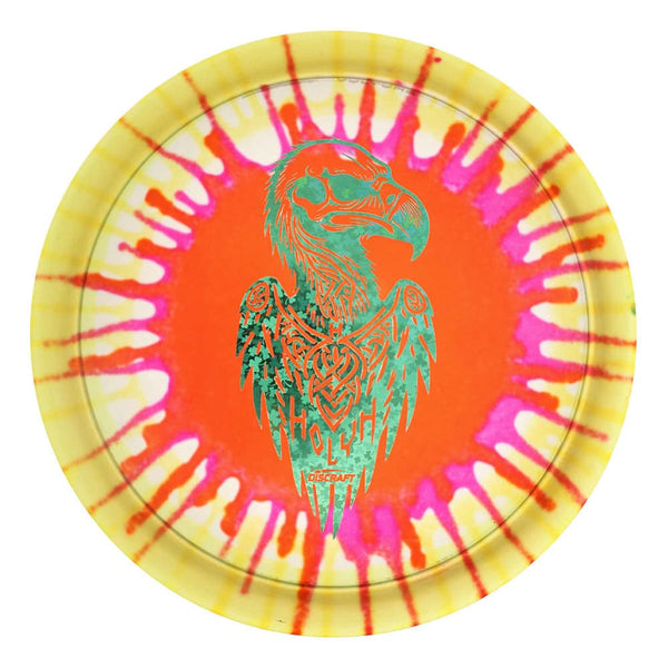 The Vulture is an overstable fairway driver. It is known for its controllability and is generally referred to as a well-seasoned Punisher. Power arms will be able to get the Vulture to provide a small amount of high-speed turn. This special run of 200 discs in honor of Holyn Handley comes in both standard Fly Dye as well as the popular Flag Dye. They fly like standard Z. The stamp depicts the crest-like bust of a vulture with a unique feather pattern framing “HOLYN”.